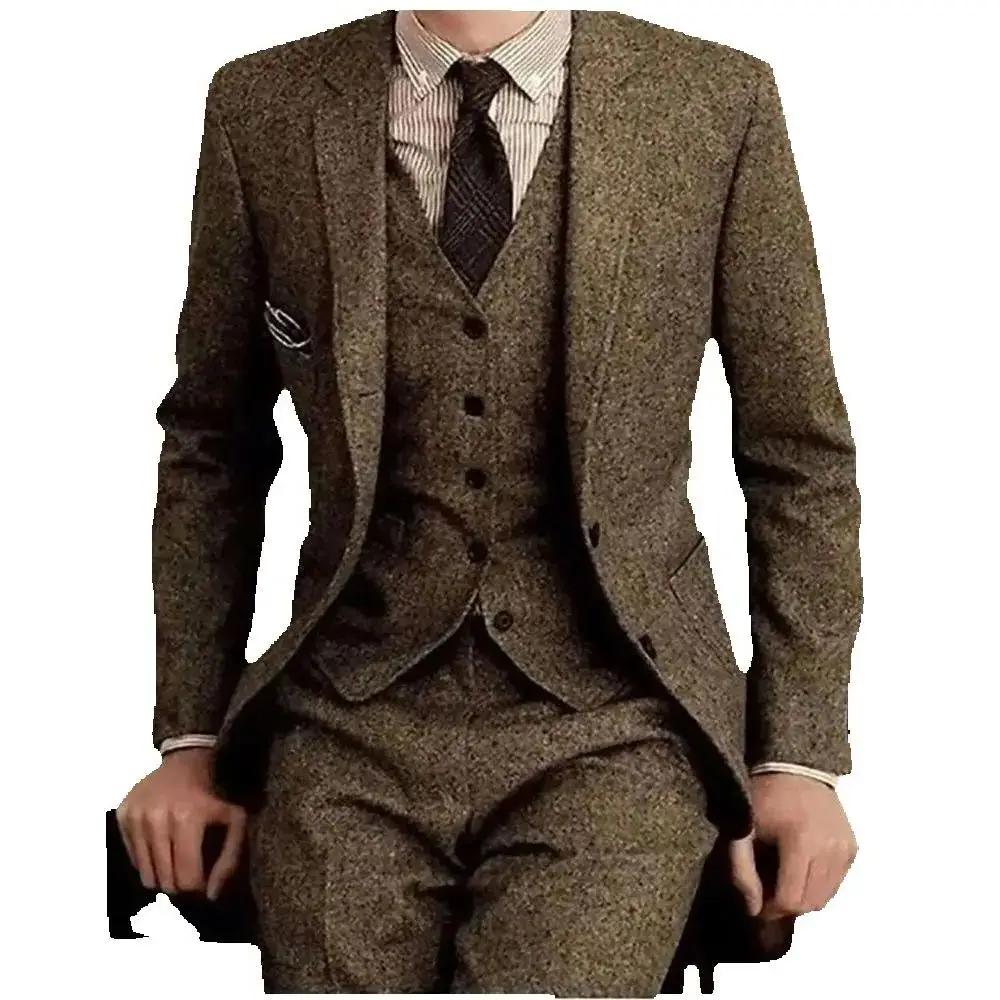 Brown Wool Tweed Men Suits 3 Piece Formal Business Suit Set Gentle-Mens Groom Wedding Dress Blazer Suit Male (Jacket+Pants+Vest)