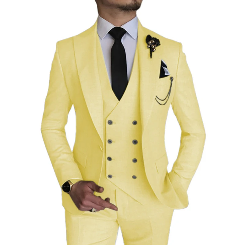 Men Suit Yellow Linen Beach Slim Fit 2 Piece Wedding Groom Tuxedo with Peaked Lapel Male Fashion Costume Blazer with Pants