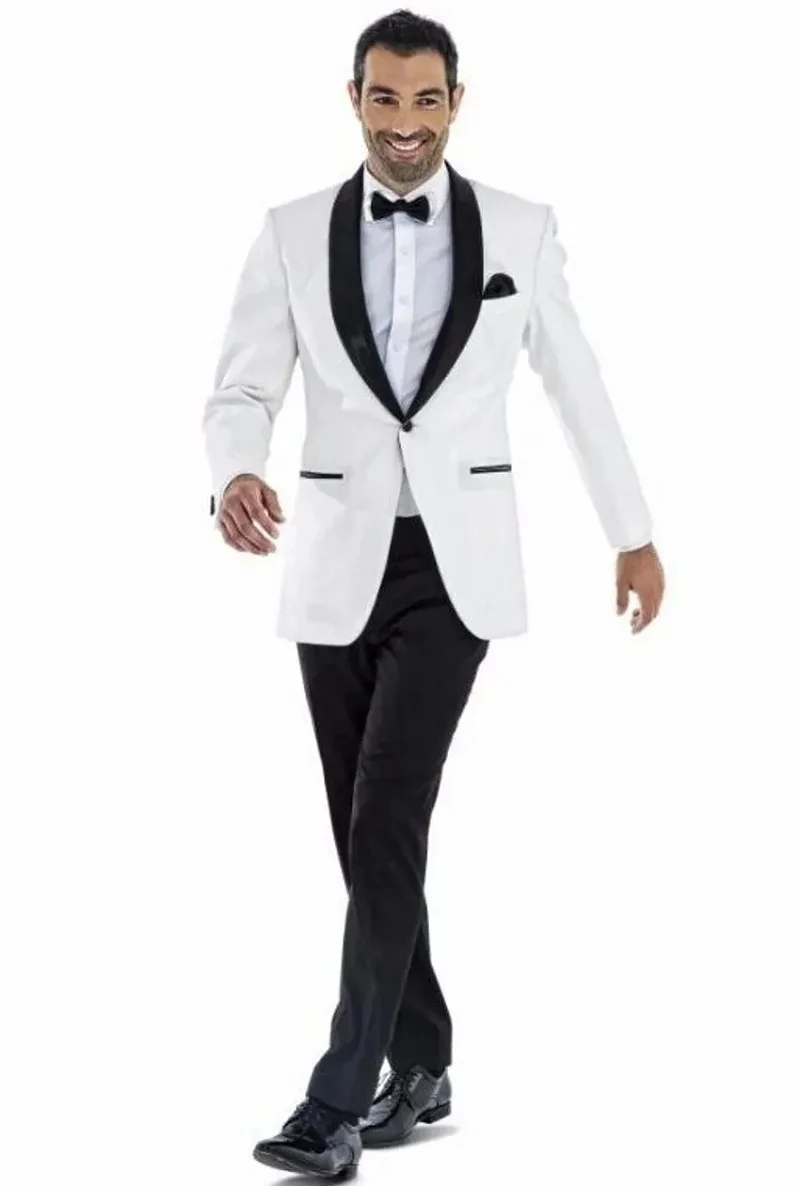 White Groom Tuxedos Black Shawl Lapel Slim Fit Men Wedding Tuxedo Fashion Men Jacket Blazer Men Prom Dinner Men Suit 2 pieces